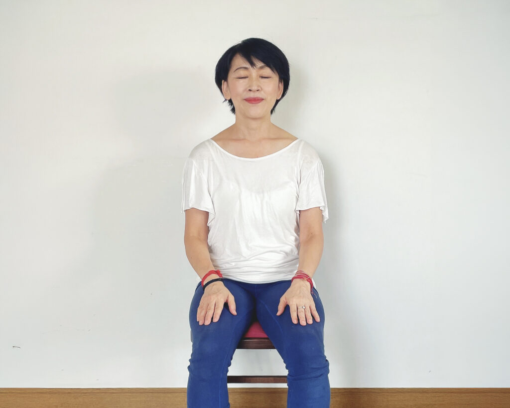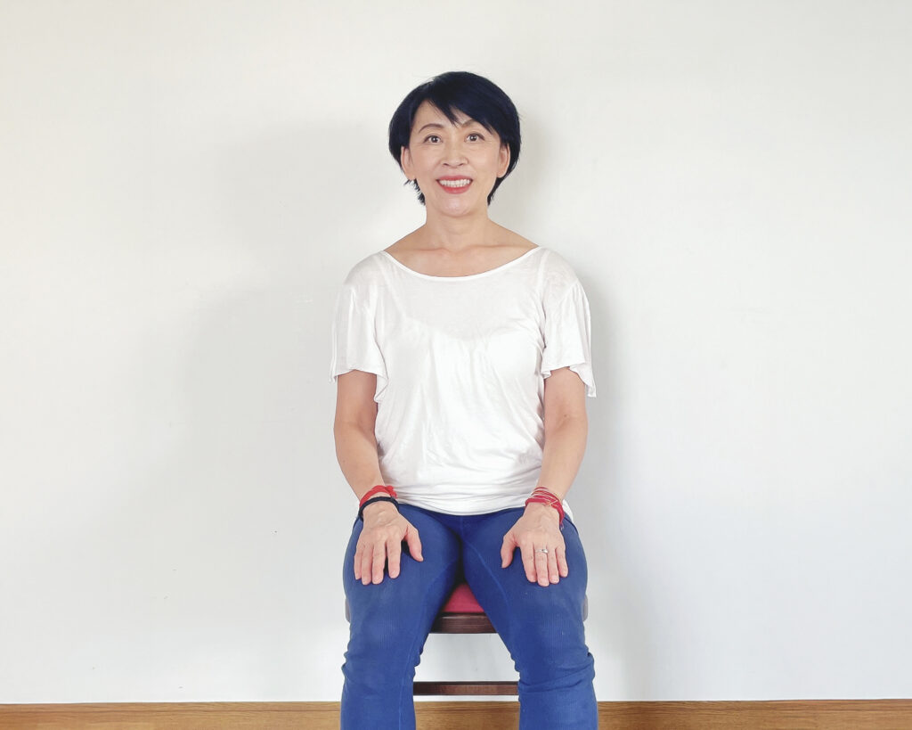 1)椅子に腰かけ、背筋を自然に伸ばします。