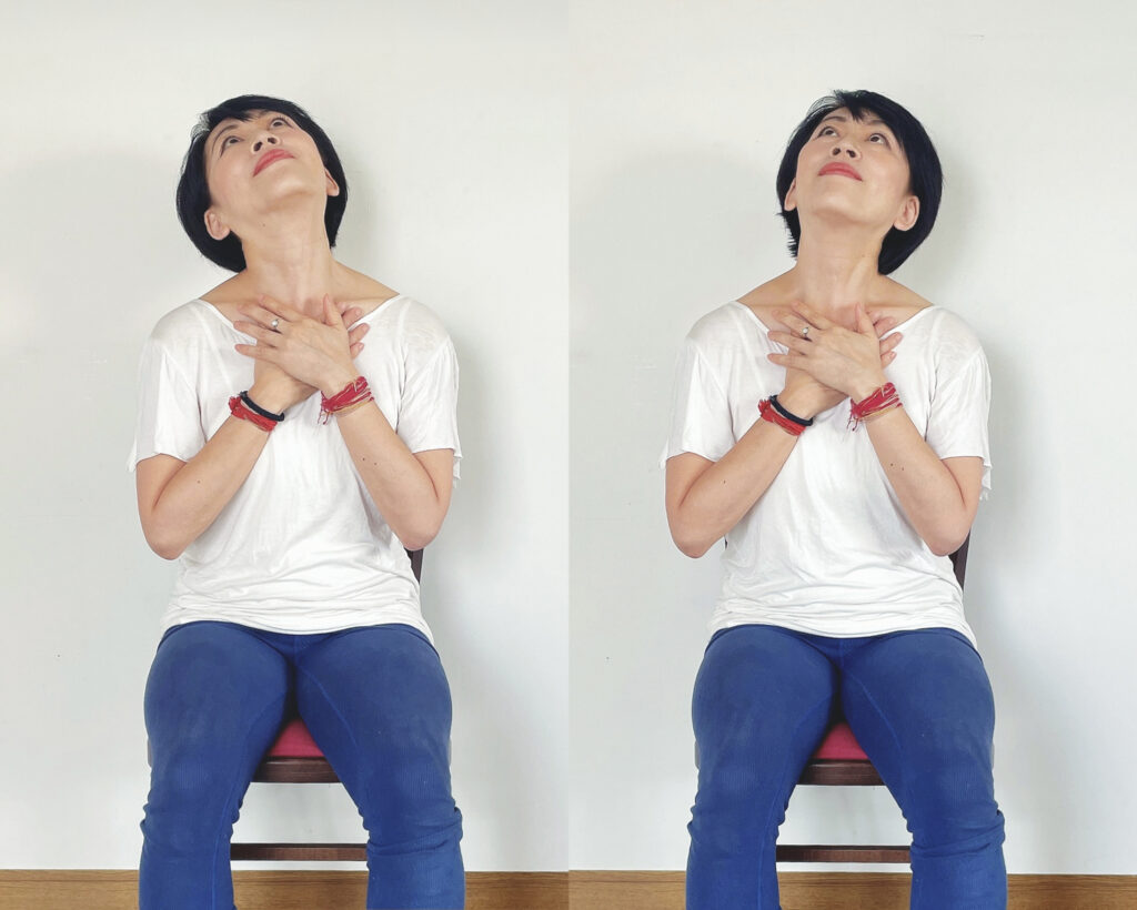 小さな動作ですが、鎖骨まわりがやわらぐと胸は自然にひらき、深い呼吸へと導かれます。さらに、上を向いたときに舌を上へ伸ばすことで、首や舌の筋肉もほどけ、呼吸の通り道がふわっと広がります。