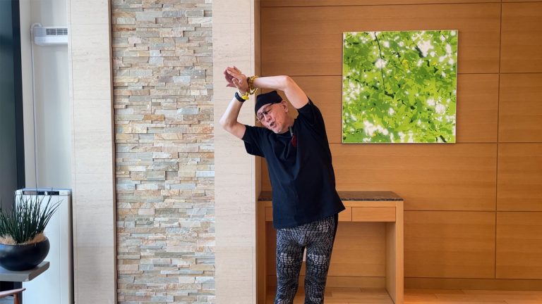 「手を後ろに組んでぐーっと手を斜め下に向けて伸ばします。肩甲骨がほぐれ、巻き肩矯正になり、胸が開くクセがつくようになります。リンパがスムーズに流れるようになると、疲労物質も流れますよ。」