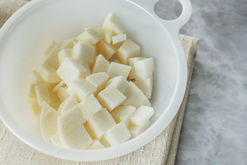 長芋は皮をむいて角切りにして乗せて炊く。ほくっとした食感とやさしいとろみが魅力です。