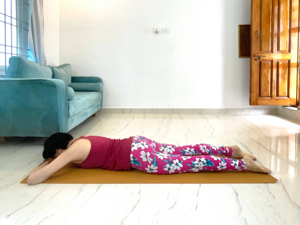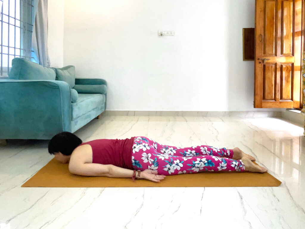 ❹息を吐きながら上体をやさしく下ろし、両手を重ねてその上に顔を乗せ、5呼吸お休みします。