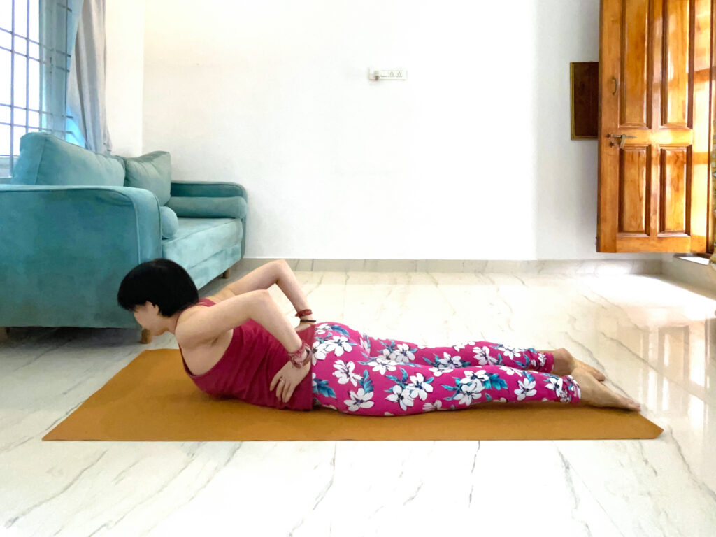 ❸息を吸いながら上体を持ち上げ、5呼吸行います。 自重で背骨や背筋を強くしますが、無理ない高さを探してくださいね。
