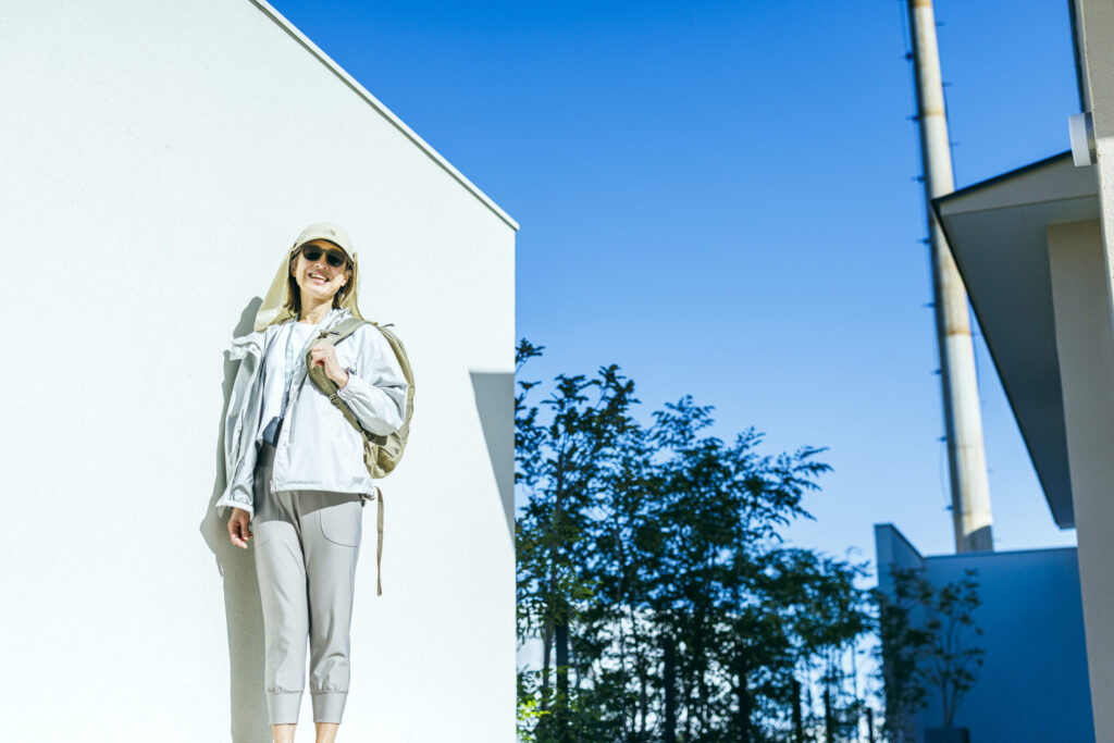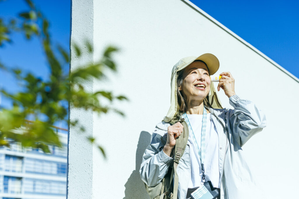 UVカット機能のあるシェード付きキャップをかぶり、日焼け止めは汗をかいたと感じるたびに塗り直しています。