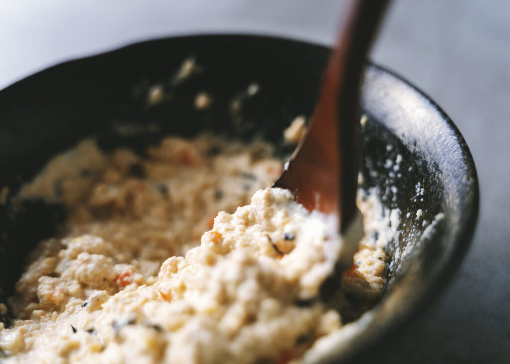 ボウルにおからを入れ、マヨネーズ、プレーンヨーグルト、塩麹を混ぜるだけ。味を見ながら、クリーミーさはヨーグルト、塩味は塩麹で整えていきます。蒸す、剥く、潰すという工程がないのに、満足感はしっかり。食物繊維も豊富で、身体も軽やかです。