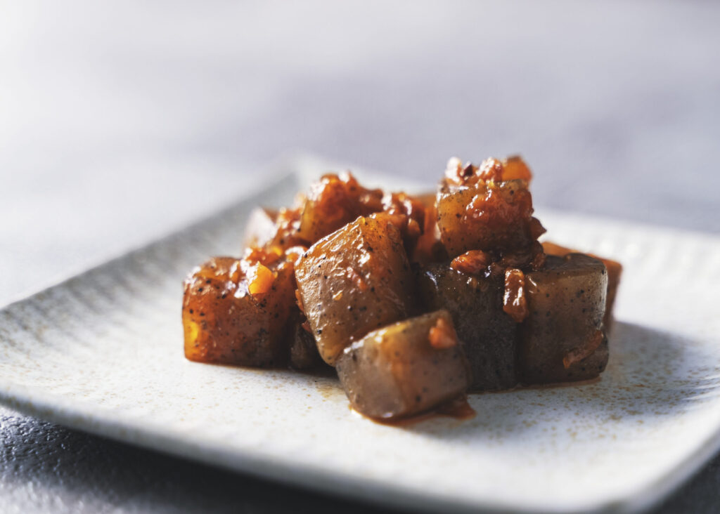 梅の酸味、みりんのふくよかな甘み、そして、こんにゃくの歯触り。一粒一粒をしみじみ味わいたくなる一皿です。