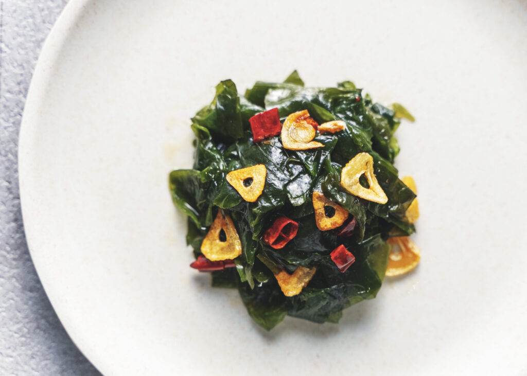 味噌汁や酢の物の定番であるわかめも、にんにくと赤唐辛子をオリーブオイルでさっと火を通し、塩を挽くだけで、ぐっと表情が変わります。