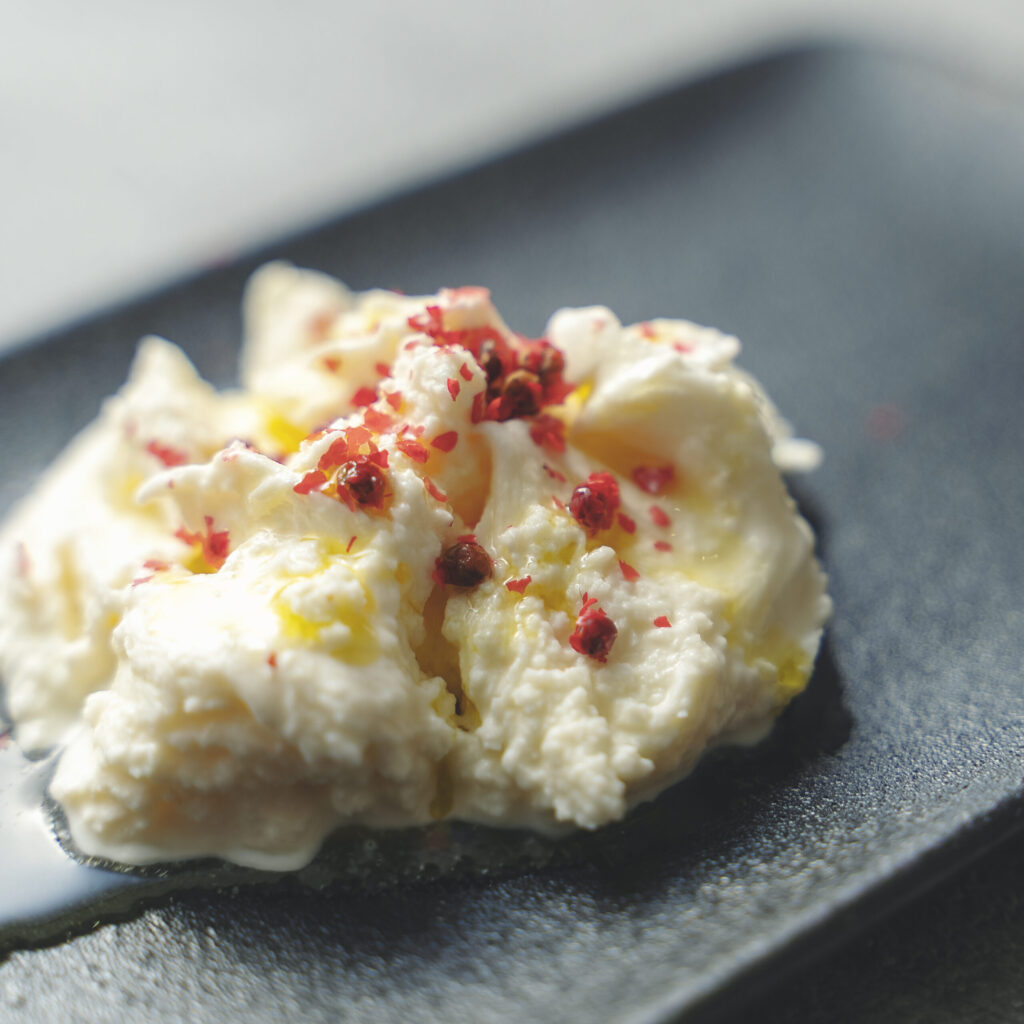 塊のモツァレラチーズは水を捨て、手で一口サイズにちぎります。しっかり水気を切ったら皿に盛り、エゴマ油、ごま油、またはオリーブオイルを一回し。そこに塩と、有ればピンクペッパーをひねり入れて完成です。