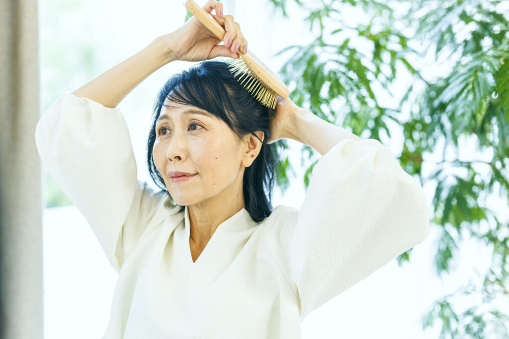 「30代の頃は、すぐ結果を求めていましたが、ロングヘアなら伸びるまでに半年〜1年以上かかりますよね。大切なことほど時間がかかる。だからこそ、続けるケアに意識が向きました。」 食事や睡眠にも気を配りながら、今はブラッシング習慣を大切にしているそう。血行を促し、巡りのよい頭皮環境を目指しています。